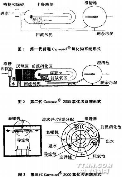 第一代為普通Carrousel氧化溝,該種形式氧化溝以去除BOD為主要目的,并具一定的脫氮除磷效果;第二代為Carrousel2000氧化溝,該種形式氧化溝主要是針對(duì)排放標(biāo)準(zhǔn)對(duì)氮、磷的嚴(yán)格要求而發(fā)展起來(lái)的具有脫氮除磷的工藝;第三代是Carrousel3000氧化溝,其最顯著的特點(diǎn)是水深很大,減少了占地面積,同時(shí)也具備脫氮除磷功效。如圖1、圖2和圖3所示。