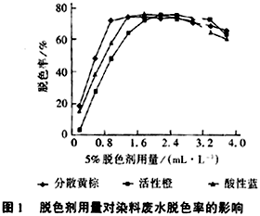 2.2 脫色劑用量對脫色率的影響 脫色劑的用量是影響染料溶液脫色的重要參數之一。試驗表明,染料的種類不同,對脫色劑用量的要求有所不同。本試驗考察了脫色劑用量對幾種染料脫色率的影響,結果見圖1。