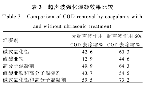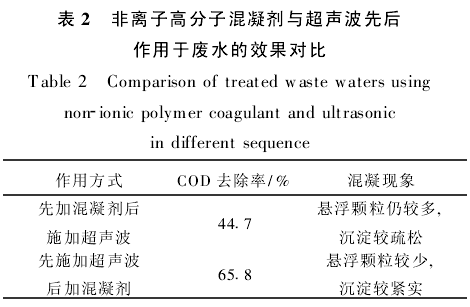 在制革加工過(guò)程中,脫脂、脫毛、軟化、染色和加脂等工序所產(chǎn)生的廢水中含有大量的有機(jī)物,一般未經(jīng)處理的制革綜合廢水中COD值可高達(dá)4000mg/L~6000mg/L.目前,國(guó)內(nèi)外制革廠處理制革廢水有機(jī)物的方法主要有生物法和混凝固液分離法,將超聲波技術(shù)應(yīng)用于制革廢水處理的研究還未見(jiàn)報(bào)道.實(shí)際上,近年來(lái)國(guó)內(nèi)外已有一些將超聲波技術(shù)應(yīng)用于水污染控制方面的報(bào)道,如超聲強(qiáng)化處理高濃度有機(jī)廢、超聲降解水體中的環(huán)狀有機(jī)污染物、農(nóng)藥類(lèi)物質(zhì)、酚類(lèi)等.研究表明,超聲降解水體中的化學(xué)污染物,可單獨(dú)或與其它水處理技術(shù)聯(lián)合使用,是一種極具發(fā)展?jié)摿Φ乃幚硇录夹g(shù).本文探索超聲波技術(shù)結(jié)合混凝沉淀法處理制革廢水中有機(jī)物的強(qiáng)化途徑和處理?xiàng)l件.1 實(shí)驗(yàn)部分1.1 實(shí)驗(yàn)儀器 TC型高溫高聲強(qiáng)超聲波儀(成都市九洲機(jī)電工程研究所);攪拌器.1.2 實(shí)驗(yàn)的試劑及水樣 堿式氯化鋁(工業(yè)級(jí)),硫酸亞鐵(工業(yè)級(jí)),非離子型高分子混凝劑(本實(shí)驗(yàn)室自制).實(shí)驗(yàn)用廢水取自四川溫江科嘉制革廠的綜合廢水.1.3 實(shí)驗(yàn)方法 (1)超聲波作用條件 所用超聲波儀聲強(qiáng)為1.47W/cm2,頻率為24kHz.每個(gè)廢水樣400ml,超聲波作用于廢水的時(shí)間分別為10s、30s、60s、600s、1200s、1800s、3600s、5400s、7200s,測(cè)定超聲波作用后廢水的和混凝劑的混凝作用,控制超聲波作用最長(zhǎng)時(shí)間為1800s. (2)混凝沉淀法處理廢水 選擇不同的混凝劑單獨(dú)使用或混合使用處理廢水,混凝劑濃度為1%,每個(gè)廢水樣為400ml,分別加入0.5ml、1ml、2ml、4ml、6ml、8ml混凝劑,相當(dāng)于樣液中混凝劑濃度分別為12.5mg/L、25mg/L、50mg/L、100mg/L、150mg/L、200mg/L,快速攪拌10min,靜置2h,取上層清液測(cè)定COD值. (3)強(qiáng)化混凝沉淀時(shí)超聲波施加方式的選擇 400ml廢水中加入1%的非