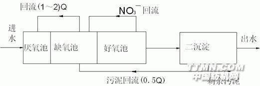 UCT工藝與A2/O工藝不同之處在于沉淀池污泥回流到缺氧池而不是回流到厭氧池,這樣可以防止由于硝酸鹽氮進(jìn)入?yún)捬醭?,破壞厭氧池的厭氧狀態(tài)而影響系統(tǒng)的除磷率。增加了從缺氧池到厭氧池的混合液回流,由缺氧池向厭氧池回流的混合液中含有較多的溶解性BOD,而硝酸鹽很少,為厭氧段內(nèi)所進(jìn)行的有機(jī)物水解反應(yīng)提供了最優(yōu)的條件。在實(shí)際運(yùn)行過(guò)程中,當(dāng)進(jìn)水中總凱氏氮TKN與COD的比值高時(shí),需要降低混合液的回流比以防止NO3-進(jìn)入?yún)捬醭?。但是如果回流比太小,?huì)增加缺氧反應(yīng)池的實(shí)際停留時(shí)間,而實(shí)驗(yàn)觀測(cè)證明,如果缺氧反應(yīng)池的實(shí)際停留時(shí)間超過(guò)1h,在某些單元中污泥的沉降性能會(huì)惡化。