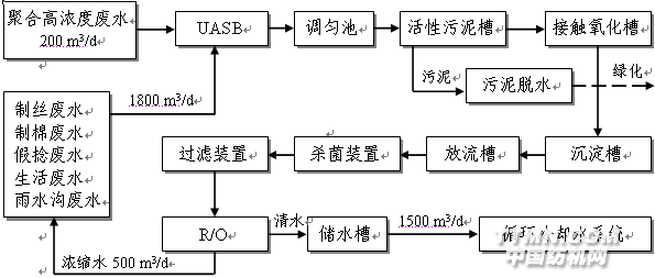 1、試點概況 廈門翔鷺化纖股份有限公司位于海滄南部工業區,占地60.33公頃,總投資4.75億美元,1995年建成投產,主要生產聚酯切片、滌綸長絲、滌綸預取向絲及滌綸短纖維,年設計產能35萬噸,是國內大型化纖生產企業之一。 該公司原日排放廢水量1000-2000噸,每年排放廢水量約50萬噸,排放廢水COD為60-80mg/l,同時廢水處理裝置每天產生剩余污泥約10噸(含水率85%)。為了節約水資源和減輕海域污染負荷,公司于2001年開始規劃廢水零排放工程,通過資料收集、試驗、考察以及方案篩選等過程,確定了適合公司廢水特性的回收方案,同時還研發出廢水回收關鍵工藝中的UASB運行技術和R/O(反滲透)的殺菌技術、阻垢技術及抗污染技術,并于2003年12月建成一套廢水深化處理和回收裝置,從而實現了廢水零排放。2、流程分析翔鷺紡纖工業廢水零排放系統示意圖 該工程通過增設一套處理能力為200 m3/d(COD=25000mg/l)的UASB處理裝置,把排放廢水COD由80mg/l降至40-50mg/l,并通過該厭氧處理裝置部分消化原好氧處理裝置所產生的剩余污泥,減少剩余污泥的排放量。另增設一套處理能力為84m3/h的R/O處理裝置進行廢水回收,回收后廢水COD<10mg/l、電導率<80μS/cm,可替代自來水作為全廠冷卻循環水系統的補充水,從而既節約自來水用量,又實現廢水零排放。