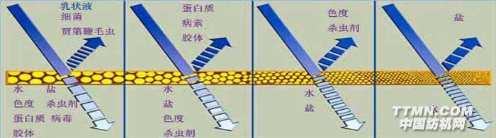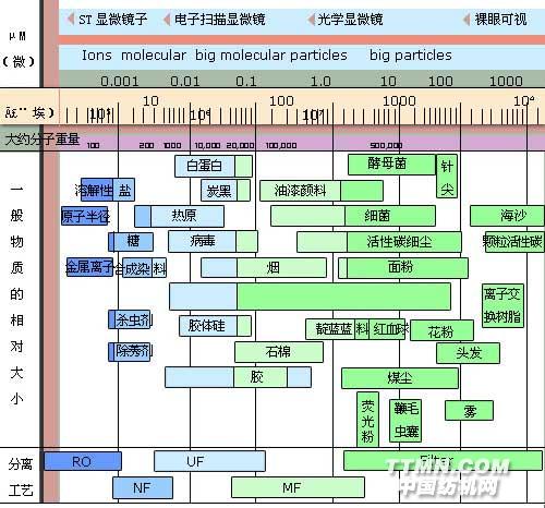 下圖顯示了水中各種雜質的大小和去除它們所使用的分離方法。反滲透主要用來去除水中溶解的無機鹽;而超濾則可以去除病毒、大分子物質、膠體等;微濾一般能夠去除水中的細菌、灰塵,具有很好的除濁效果。這些都是傳統的過濾(如砂濾、多介質過濾等)無法實現的。