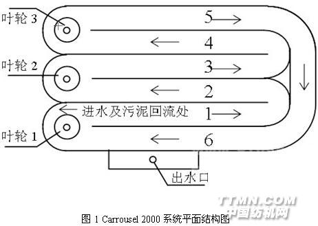 由圖可見,Carrousel氧化溝使用定向控制的曝氣和攪動裝置,向混合液傳遞水平速度,從而使被攪動的混合液在氧化溝閉合渠道內循環流動。因此氧化溝具有特殊的水力學流態,既有完全混合式反應器的特點,又有推流式反應器的特點,溝內存在明顯的溶解氧濃度梯度。氧化溝斷面為矩形或梯形,平面形狀多為橢圓形,溝內水深一般為2.5~4.5m,寬深比為2:1,亦有水深達7m的,溝中水流平均速度為0.3m/s。氧化溝曝氣混合設備有表面曝氣機、曝氣轉刷或轉盤、射流曝氣器、導管式曝氣器和提升管式曝氣機等,近年來配合使用的還有水下推動器。
