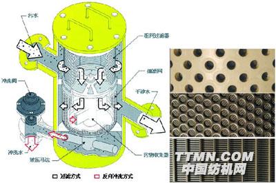 工作原理:Tekleen®自清洗過濾器是由過濾器本體、濾網、沖洗閥和沖洗控制器組成。水流進入Tekleen®過濾器后,首先通過粗濾網,然后進入細過濾室,由細濾網將污物(最小可至 2μm)截留下來,出水即為凈水。污物聚集在細濾網上,使濾網內表面和外表面形成壓力差。當壓差達到預設值時,便啟動自清洗循環。壓差傳感器將信號傳至控制器觸動其打開沖洗閥,這樣液壓馬達室內、污物收集器及吸嘴內的壓力降至與大氣相通。引起吸嘴相對的細濾網內面(污水)和細濾網外面(凈水)之間的壓力差,產生一股吸力強勁的反沖洗水將吸嘴相對的濾網上的污物清洗干凈,由沖洗閥排出。反沖洗水經過液壓馬達時帶動污物收集器轉動,這樣吸嘴就將整個濾網上的污物吸走清洗干凈。 當濾網沖洗干凈,控制器關閉沖洗閥,設備自動恢復到全濾狀態。整個反沖洗過程只需幾秒鐘,而且期間主流不間斷,也無須更換濾芯。沖洗用水只占主流 1%。