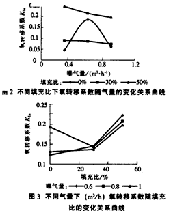 試驗(yàn)表明:曝氣量和填充比同時(shí)影響著氧轉(zhuǎn)移系數(shù)。在無填料的情況下,曝氣量是主導(dǎo)因素:氧轉(zhuǎn)移系數(shù)隨著曝氣量的增加先增大而又減小。因?yàn)樵诘蜌饬康臈l件下,隨著氣體流量的增大,含氣率增大,相應(yīng)地增大了氣液接觸面積;而當(dāng)氣體流量增大到一定程度后,曝氣產(chǎn)生的氣泡直徑變大,上升速度快,氣泡更易于逃逸,使氧轉(zhuǎn)移系數(shù)降低。 在一定的填充比的情況下,一方面由于填料占據(jù)本來的一部分液體空間導(dǎo)致反應(yīng)器內(nèi)含氣率下降,另一方面由于填料切割氣泡的作用使氣泡直徑變小而增大轉(zhuǎn)移系數(shù)。從圖中可以看出,在氣量為