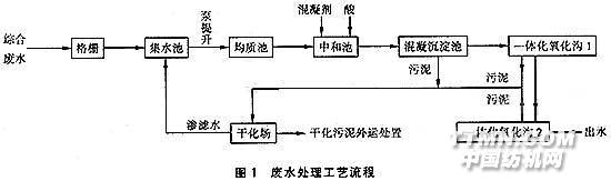 3 主要處理構筑物及設計參數3.1 集水池 集水池尺寸為5.6m×2.5m,HRT=20min,底部設有兩臺進口的FLYGT潛污泵。潛污泵設有液位自動控制裝置以利保護潛污泵和適應進水流量變化。3.2 均質池 均質池尺寸為14.7m×5.2m,有效水深為4.1m,調節時間為2.5h,水面上設有兩臺進口浮船式射流攪拌器,起攪拌混合作用。由于氧化溝有較強的耐沖擊負荷,所以均質池的HRT較短。3.3 中和池 中和池尺寸為2.5m×2.1m,有效水深為2.5m,反應時間為6min。在中和池內投加聚合硫酸鐵和少量濃硫酸,起到調節pH值和快速混凝反應作用。中和池設有機械攪拌機,還設有一套投加混凝劑系統和pH自動、手動控制加酸系統。控制pH值在7~9之間。另設有貯酸槽和貯混凝劑槽,均采用UPVC板襯里防腐,有效容積分別為2.5m3和8m3。3.4 混凝沉淀池 混凝反應池采用旋流孔室反應池,分正方型倒角六室,上下穿孔,分兩個系列。反應總時間20min。 每系列反應池配套一座沉淀池,型式是多斗式平流沉淀池,HRT=2.5 h,表面負荷為1.4m3/(m2·h),