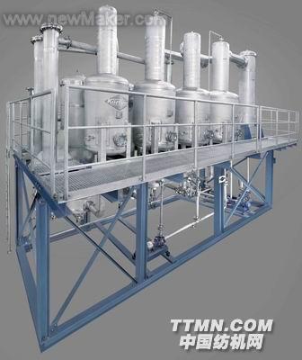德國Körting研發了特殊的蒸發設備,可以重新濃縮弱堿液,并繼續用于其它整理工藝。系統的特點包括:回收堿液,減少新鮮堿液成本,回收的堿液可以用于其它整理工藝;工藝廢水中的PH值明顯降低(絲光工藝中的洗滌水是堿性的主要來源);解決了濕布絲光工藝中的過量堿液問題;蒸發裝置的運行只需要蒸汽這一能源,蒸汽用來加熱弱堿液,離開蒸發系統后又轉換成熱水用于其它用途,因此,蒸發系統基本沒有任何的能源消耗;弱堿性蒸汽冷凝液(軟水)可以用做洗滌水,例如用于預處理、絲光或漂白過程,有時經過特殊處理還可以用于鍋爐用水;從第一級排出的加熱蒸汽可以返回鍋爐間。