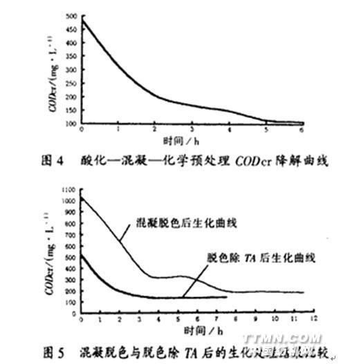 圖4是混合污水經(jīng)酸化—化學(xué)混凝預(yù)處理后污水的生化降解曲線。結(jié)果表明:經(jīng)化學(xué)混凝處理的出水繼續(xù)進(jìn)行生化處理,可以做到達(dá)標(biāo)排放。