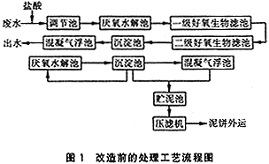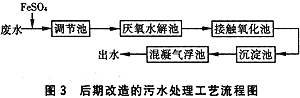 改造的主要構(gòu)筑物及設(shè)備: ① 調(diào)節(jié)池。設(shè)計原水調(diào)節(jié)池有效停留時間為8 h,整個調(diào)節(jié)池尺寸為20m×10m×2.5m ,內(nèi)分6格。在原水進(jìn)調(diào)節(jié)池前有一小渠道,在渠道中投硫酸亞鐵,使pH為7~9左右。廢水在調(diào)節(jié)池內(nèi)有一初沉?xí)r間,對池底污泥,紡織廠每年趁春節(jié)放假之際清掏外運(yùn)。 ② 厭氧水解池。呈長方形,尺寸為10m×7.5m×5m,有效停留時間10h。分為兩組 ,每組都有一個脈沖布水器,其對水解池內(nèi)的配水是間歇式的,對厭氧池則起攪拌、沖刷作用。厭氧池內(nèi)的污水分污泥層、附著層、清水區(qū)。攪拌是為了防止死水、短流,沖刷能防止附著層阻塞,厭氧池內(nèi)設(shè)有斜板附著層,厭氧水解池是穿孔集水槽配水。 ③ 接觸氧化池。在原生物濾池的位置上建造,外型尺寸:20m×15m×4.5m,采用三廊道 ,內(nèi)懸掛半軟性填料(厚3m),填料接觸時間20h,底部裝有微孔曝氣頭,氣水比為15∶1, 經(jīng)測試池內(nèi)溶解氧濃度為3.8mg/L。 ④ 沉淀池。為豎流式、方形,尺寸為6 m×5 m×5 m,從池頂中心進(jìn)水,出水經(jīng)鋸齒形集 水槽。豎流式沉淀池主要是沉淀接觸氧化池脫落的生物膜,出水進(jìn)入混凝氣浮池。 沉淀污泥全部回流至厭氧水解池,補(bǔ)充營養(yǎng),原設(shè)計進(jìn)入貯泥池的排泥管保留。 ⑤ 混凝氣浮池。進(jìn)一步去除在沉淀池中不能下沉去除的細(xì)小顆粒,投加凈水劑,凈水劑是