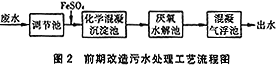 2.1 前期改造 捷德紡織廠采取邊改造邊生產(chǎn)的方式進(jìn)行。由于二級生物濾池對有機(jī)物的降解率只有30%~4 0%,且滋生蚊蠅,決定利用現(xiàn)有的厭氧水解池,打掉二級生物濾池,改成生物接觸氧化池。 但厭氧水解池對COD的去除率僅有10%~20%,大量負(fù)荷會帶給后續(xù)處理構(gòu)筑物,為減少生化改造期間的污染,在厭氧水解池前加一套物化處理設(shè)備(即化學(xué)混凝沉淀),以降低負(fù)荷。 前期改造的工藝流程見圖2。