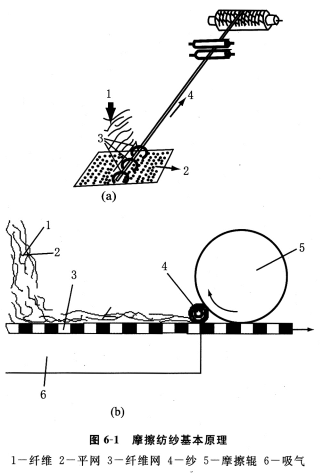 如圖6—1所示,經過開松的單纖維1由氣流快速輸送到一個帶孔而有吸氣的網狀運動表面2,其運動方向與成紗輸出方向垂直。被吸附凝聚的網狀纖維由于與網狀運動表面接觸,且其間有吸氣壓力,它們之間因此產生摩擦力或用一摩擦輥(如圖b)使纖維網繞自身軸線滾動而被搓動,加捻成紗。被加捻成紗的須條以一定速度不斷地從垂直于纖維輸送的方向和網運動方向輸出,纖維不斷地輸送、凝聚在網的表面,經摩擦搓動成紗,連續輸出,形成自由端連續紡紗。