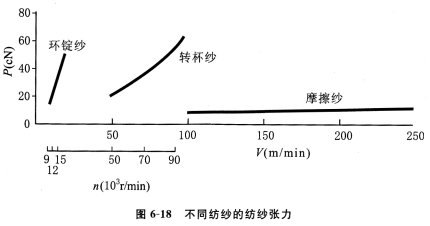 (2)低張力紡紗。摩擦紡的紡紗速度為環錠紡的10—25倍,轉杯紡的2.5倍,但紡紗張力只有環錠紡的20%,轉杯紡的14%,如圖6—18所示,這導致纖維在紡紗過程中內外轉移困難,纖維伸直少,毛羽多。