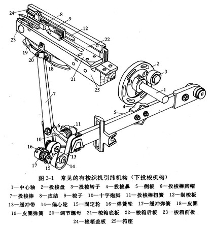 常見的引緯機構(投梭機構)有三種。根據傳遞投梭棒運動的作用力位置的高低分上投梭、中投梭、下投梭。
