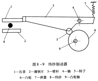 緯紗制動器的結構示意圖如圖8—9所示,它由瓷質的壓掌1與一片厚度為0.04~0.07mm的拋光薄鋼片2組成,緯紗8在壓掌與薄鋼片2之間通過。根據壓掌1對薄鋼片2的壓緊程度,使紗線在壓掌表面與薄鋼片之間產生不同的摩擦力。壓掌1固裝在臂桿3上,臂桿以軸4為擺動中心,它的下臂端裝有轉子5,依靠彈簧7的作用使轉子與裝在凸輪軸9上的凸輪6相接觸。當凸輪回轉時,壓掌就做上下擺動,壓掌與薄鋼片的接觸程度就發生變化,從而控制對緯紗的制動作用。