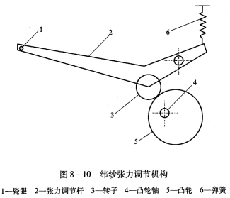 圖8—10是緯紗張力調節機構簡圖,在張力調節桿2的頂端有瓷眼1,緯紗從瓷眼中穿過。由于彈簧6的拉力,使張力調節桿2上的轉子3與凸輪5接觸,凸輪5的回轉使張力調節桿2上下擺動。凸輪軸4與圖8—9中的凸輪軸9相同。