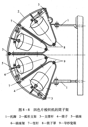 緯紗卷裝安裝在織機左側的筒子架上,俯視圖如8—8所示。筒子架的兩個托腳1與織機的左墻板連接,弧形支架2就固定在這兩個托腳上,另外三根支撐桿3垂直于地面,用以支撐弧形支架的負荷。從筒子4上退繞下來的緯紗,經導紗瓷眼9引出,四個有機玻璃制成的筒子罩8將四列筒子分割開來,以防止紗線退繞時相互糾纏。