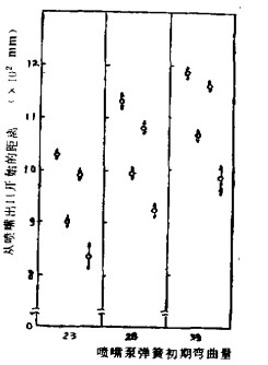 圖1所示在雙噴踞兩緯換噴的織機上(幅~150cm,車速42O轉/分),噴射泵彈簧的初彎曲量在三個階段里變化的情況下,從噴咀里噴射出的水速為34.8米/紗時,測出的緯絲頭部位置的結果。圖中縱座標表示離開噴咀頭部的距離。在各個初期彎曲量中,4個“0符號