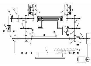 傳統的噴氣織機的傳動系統如圖11-2所示。主電動機通過組合型三角皮帶傳動織機主軸1,由主軸通過主軸齒輪2及中心軸齒輪3傳動中心軸4,再由中心軸齒輪3和絞邊軸齒輪5傳動絞邊軸6。主軸與中心軸的轉速比為2:1,與絞邊軸的轉速比為1:1。窄幅噴氣織機通常通過四連桿裝置驅動打緯機構,主軸通過連桿機構的牽手8使擺臂(筘座腳)9往復擺動,帶動鋼筘打緯。同時,由絞邊軸傳動絞邊機構7,并通過三角皮帶輪14傳動送經機構。另外主軸通過齒型帶輪