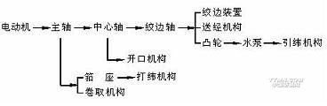 在有梭織機上,首先由電動機通過皮帶傳動驅動主軸回轉,再由主軸傳動其它機構。