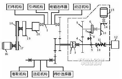 10-定位圈? 11-彈簧? 12-開口機(jī)構(gòu)? 13、14-斜齒輪? 15-尋緯電動機(jī)