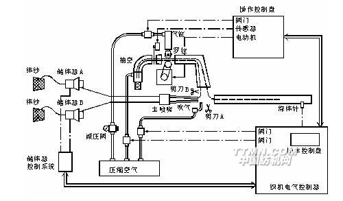 當(dāng)織機(jī)因緯紗故障而停車時,為了減少擋車工處理停臺時間,降低勞動強(qiáng)度,提高織機(jī)0生產(chǎn)效率,無梭織機(jī)還安裝有自動找梭口裝置。高檔噴氣織機(jī)還配備有緯紗斷頭自動處理系統(tǒng)。