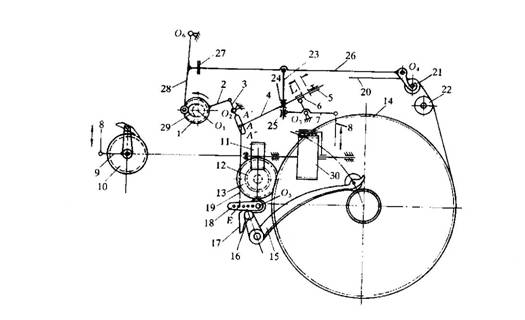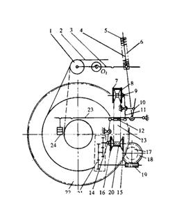 1-偏心盤? 2-外殼? 3-擺桿? 4-拉桿? 5-擋圈? 6-擋塊? 7-三臂桿? 8-小拉桿? 9-雙臂撐桿? 10-棘輪? 11-蝸桿? 12-蝸輪? 13-齒輪? 14-織軸邊盤齒輪? 15-轉臂? 16-轉子? 17-雙曲線凸輪板? 18-調節轉臂19-連桿? 20-經紗? 21-活動后粱? 22-固定后粱? 23-調節桿? 24-擋圈? 25-擋塊? 26-扇形張力桿? 27-制動器? 28-制動桿? 29-開放凸輪