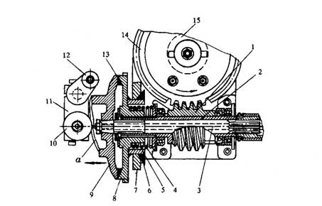 12-連桿? 13-摩擦環? 14-蝸輪? 15-送經齒輪? a-主動摩擦盤凸輪面