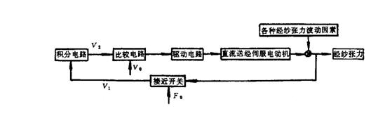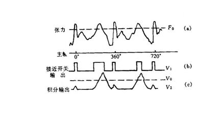 圖10-16表示了經紗張力采集、處理和控制原理。當經紗張力大于預定數值F0時,見圖10-17(a)中虛線所示,鐵片對接近開關的遮蓋程度達到使振蕩回路停振,于是開關電路輸出信號V1,見圖10-17(b)所示。F0的數值由調整張力彈簧剛度和接近開關安裝位置來設定。信號V1經積分電路、比較電路處理,如圖10-17(c)所示。當積分電壓V2高于設定電壓V0,則輸出信號(V2-V0)通過驅動電路使直流送經伺服電動機轉動,織軸放出經紗。輸出信號(V2-V0)越大,電動機轉速越高,經紗放出速度越快。當V2<V0時,電動機不轉動,織軸被鎖定,經紗不能放出。