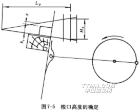 確定合理的梭口高度,涉及的因素很多,既要考慮引緯器的結構尺寸,又要考慮到引緯運動與筘座運動的合理配合,同時與織物的結構、經紗性質及織物品種等因素有關。通常是在鋼筘處于最后位置時,根據引緯器的結構尺寸來確定梭口的合理高度。現以梭子引緯為例,根據梭子的高度和寬度,同時注意在筘座擺到最后位置時梭子正通過梭口這一條件,如圖7-5所示。該時梭子前壁處的梭口高度h0(h0=hs+x)一般稍高于梭子的前壁高度hs若干距離x,x的選擇確定了梭口高度。
