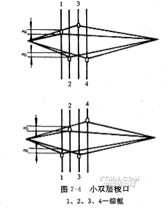 在梭口滿開時,若某頁綜框的梭口高度Hi(i=1,2…)與該頁綜框到織口的距離Li(i=1,2…)成正比,則梭口前部的上層經紗應在一個平面中,下層經紗處在另一個平面,這種梭口叫清晰梭口,如圖7-3(1)所示。在其它條件相同的情況下,清晰梭口的前部具有最大的有效空間,引緯條件最好,但是,當綜框頁數較多或綜框間距較大時,后幾頁綜框的梭口高度過大,以致于相應的經紗伸長過大,產生斷頭。為了緩解這一矛盾,通常將后幾頁綜框的梭口高度適當減小,其結果使下層經紗不處在一個平面內,上層經紗也不處在另一個平面內,這種梭口稱為非清晰梭口,如圖7-3(2)所示。雖然這種梭口各頁綜框動程差距縮小,經紗張力比較均勻,但其前部有效空間小,對引緯極為不利,易造成經紗斷頭、跳花、軋梭及飛梭等織疵或故障,故在實際生產中一般不采用這種梭口,而采用半清晰梭口,即下層經紗處于一個平面內,上層經紗不處在一個平面內的梭口,如圖7-3(3)所示。當織制細特高經密平紋織物(如府綢、羽絨布等),通常采用小雙層梭口,如圖7-4所示。該梭口屬非清晰梭口,即不論在上層或下層,總是第三頁綜的經紗高于第一頁綜的經紗δ,第四頁的經紗高于第二頁綜的經紗δ,這樣可使第一、三頁綜框與第二、四頁綜框的綜平位置錯開,相當于全部經紗交錯時密度減半,有利于開清梭口。