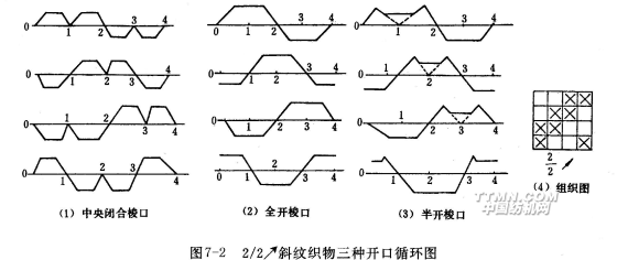 在每次開口運動中,全部經紗都由綜平位置出發,分別向上、下兩個方向分開形成所需梭口。在梭口閉合時,所有上下層經紗都要回到綜平位置。這種開口方式要求不論該綜框的經紗下一次開口時是否保持在原來位置,都必須回到綜平位置,然后再根據下一次梭口的要求由綜平位置出發,如圖7-2(1)所示。圖中的織物組織均為