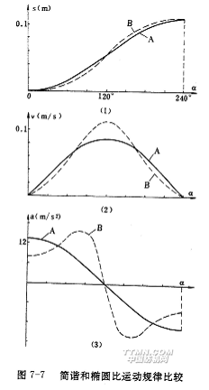 一個動點在橢圓上繞中心作等角速度轉動時,此點在橢圓短軸上的投影點的運動即為橢圓比運動規律。當橢圓的長、短半軸之比為1時,即為簡諧運動規律。橢圓的長、短半軸之比的大小對綜框運動加速度變化幅度影響很大,一般此比值取1.2~1.3。若sx、ω和αy取值同前,上述比值為1.2008時,綜框加速度最大值與簡諧運動規律相同,但綜框從靜止到運動和從運動到靜止之間過渡時的加速度值比簡諧運動規律小;比值大于1.2008時,綜框加速度最大值超過簡諧運動規律,而綜框從靜止到運動和從運動到靜止之間過渡時的加速度值變得更小。圖7-7中曲線B分別是橢圓比運動規律的位移、速度、加速度的曲線,與簡諧運動規律相比,在綜平前后經紗張力小時,橢圓比運動規律的綜框運動速度更快,更有利于開清梭口;在閉口開始后的一個時期,綜框運動更緩慢,更有利于梭子飛出梭口;綜框從靜止到運動和從運動到靜止之間過渡時的
