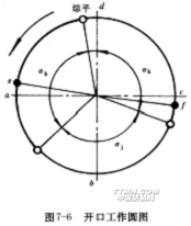 經紗從離開綜平位置,上下分開,到重新返回這個位置就完成一次開口。在開口過程中,上下交替的經紗達到綜平位置的時刻,即梭口開啟的瞬間,稱為開口時間,俗稱綜平時間,它是重要的工藝參數。通常,標注有織機主要機構運動時間參數的主軸圓周圖稱為織機工作圓圖,用以表示織機運動時間的配合關系,如圖7-6所示。圖中箭頭表示主軸回轉的方向,除個別情況外,主軸總是按逆時針方向回轉。圓周圖的前方、下方、后方和上方四個特征位置(記為a、b、c、d)分別稱為前心、下心、后心和上心。擺動筘座到達最前和最后位置e、f時,主軸所在的位置分別稱為前止點(前死心)和后止點(后死心)。前止點的主軸位置角為0°,作為度量基準。圖中開口時間的長短用開口角αk表示,靜止時間的長短用靜止角αj表示,閉口時期的長短用閉口角αb表示。在閉合和開口時期內,綜框處于運動狀態之中,所以αb+αk便是綜框運動角。應該指出,織機主要機構運動時間的配合關系有時也用周期圖表示。