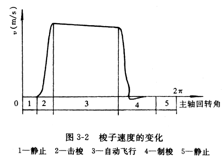 1、引緯過程——可分為擊梭、飛行階段、制梭三個過程。 擊梭:扭軸投梭。擊梭后片梭初速度與織機車速無關,而取決于扭軸的變形能量、扭軸的扭轉變形量。 飛行階段:片梭在導梭片形成的軌道內飛行。 制梭:片梭進入制梭箱后,制梭裝置吸收片梭動能,使片梭的速度迅速下降為零,并準確定位。