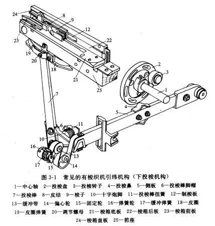 下投梭機構特點:投梭棒頂端作圓弧運動,所以皮結套在投梭棒上,擊 梭前皮結的定位不十分準確,故只用于換梭織機(棉、絲),皮結,投梭棒易損壞,噪音大。 中投梭機構特點有鐵鞋式和四連桿式。它的特點是:擊梭時皮結相對筘座的運動軌跡為一直線,皮結與投梭棒上部鉸接,皮結定位準確,有利于梭子平穩飛行,擊梭,制梭噪音下降,皮結,投梭棒的損壞減小,可用于換紆織機(毛、絲)。 |