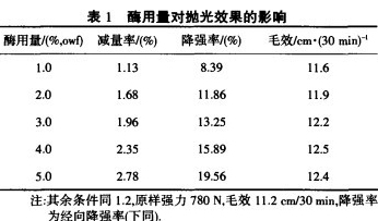由表1看出,隨著酶用量的增加,減量率和經(jīng)向降強(qiáng)率呈線性增大,毛效也提高明顯.而生物拋光整理織物的減量率不宜大于5%,強(qiáng)力損失不宜超過15%,否則會(huì)影響織物的服用性能.改善織物性能是纖維素酶處理和織物服用的要求.當(dāng)酶用量大于3%時(shí),對(duì)織物的損傷過于嚴(yán)重.因此,選擇酶用量為1%~3%.