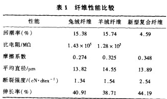 表1為幾種纖維的性能比較。從表1可以看出,羊絨纖維的回潮率較兔絨稍高,新型復(fù)合纖維的回潮率較低;兔絨的比電阻較山羊絨高,這主要是由于山羊絨的回潮率高,而兔絨的回潮率稍低;山羊絨和新型復(fù)合纖維的摩擦系數(shù)較大,兔絨纖維的摩擦系數(shù)較小,手感光滑,抱合力差,故兔絨纖維在加工及服用過程中容易滑脫而掉毛;新型復(fù)合纖維的斷裂強(qiáng)度最大,其次為羊絨,兔絨纖維的斷裂強(qiáng)度較小;3種纖維的斷裂伸長率相近。