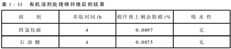 織物的吸水性是正常印染加工的首要條件,過去習慣的看法是必須去除棉纖維的脂肪和蠟質才有良好的吸水性能。但實踐證明,用有機溶劑將棉纖維上的脂蠟物質萃取后仍無吸水性能,如表1-11所示。