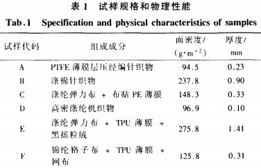 選擇4種防水透濕織物和2種普通織物作為試樣進行透濕量測試,其面密度、厚度見表l。厚度依據GB/T3820一l997,用YG(B)141D織物厚度儀測定。