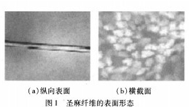 選用1.50dtex×38mm規(guī)格的圣麻纖維,其縱向表面有溝槽,橫截面呈梅花形和星形,有不規(guī)則溝痕(見圖1)。由于再生纖維素纖維大分子問氫鍵較少,且結(jié)構(gòu)呈梅花形,表面有溝痕,由此決定了該纖維具有較好的吸濕、透氣性。