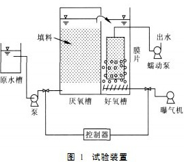 試驗裝置如圖1所示。模擬印染廢水從原水槽經泵提升后由厭氧槽底部進入系統,厭氧槽出水溢流到好氧槽,廢水經膜過濾后,由蠕動泵抽吸出水。厭氧槽的有效容積為9L,其內裝填有5cm的聚丙烯球形填料,出水為溢流出水;好氧槽為一體式膜生物反應器,內置有機平板膜,尺寸為0.303mm,0.212m,有效膜面積為0.1285m2,膜孔徑為0.1~0.4Lm,采用微孔曝氣,錯流過濾;好氧槽與厭氧槽的HRT均為24h,MLSS控制在3.0~4.5g/L,溫度為20~32℃。由時間繼電器、電磁開關和液位控制器等元件構成自控系統,控制和調節系統的進水、出水、曝氣等操作。