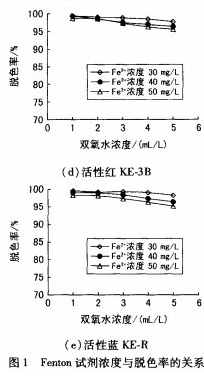 如圖1所示,當Fe2+濃度為30mg/L,H2O2用量1mI/L,反應60min和pH值為3.0時,活性黃KE一4R,活性艷紅KE一7B,活性黃KE-3G,活性紅KE一3B和活性藍KE.R染色廢水脫色率均最高,分別達到93.89%,99.41%,90.24%,98.87%和99.62~70。