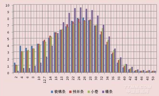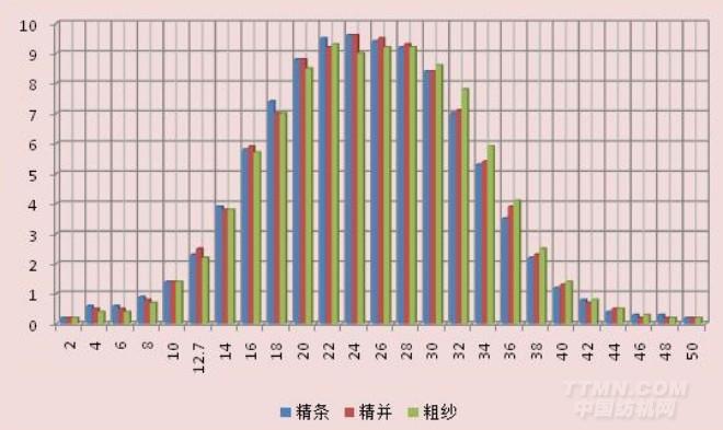 下例圖表橫座標是用AFIS儀器測試纖維所給每組纖維長度段的寬度(2mm),縱座標是每組纖維長度段內所測纖維的百分比含量(%)