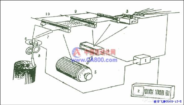 該自調勻整系統是開環控制系統,圖中喂人紗條的粗細由凹凸羅拉3檢測,紗條粗細的變化通過高精度的位移傳感器將位移變化量轉變為電信號,輸入模塊1,在計算機中與標準值(設定值)比較,然后計算出差值,并存儲下來,當被檢測的紗條到達變速點時,模塊1發出信號,使伺服電機5的轉速發生變化,從而改變二羅拉的轉速,進而改變主牽伸區10的牽伸倍數,修正喂入紗條的偏差,使輸出紗條達到均勻的目的。