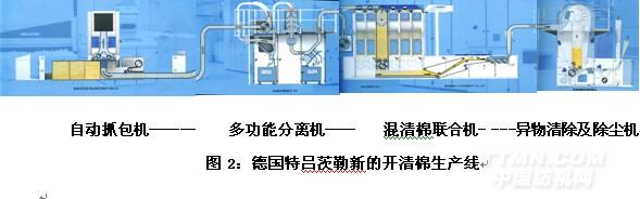 2、沒有性能好的設備是不可能生產出好的產品來的。21世紀以來世界的開清棉技術又有了新的進步,以德國特呂茨勒公司的開清棉流程為例,以往德國特呂茨勒公司的開清棉流程20世紀是全自動抓包機—-雙軸流開棉機—-多倉混棉機機—-精細清棉機—-雙棉箱給棉機—-梳棉機等,另外還有金屬探測儀、異纖清除機及微除塵機等,雖然20世紀的開清棉流程也算是短流程的開清棉體系,但這種開清棉工藝對棉纖維的損傷還較大,產生的棉結仍很多。德國特呂茨勒公司的21世紀新式超短流程開請棉機組在原開清棉短流程基楚上又有了很大的改進,把開松、除雜等功能分佈于全流程的四個機器上,即:自動抓包機--多功能分離裝置--混棉清棉聯合機--異物分離裝置等。即完成了清除異纖、清除雜質等任務又完成了開松的任務。不論除雜還是開松的作用在四個工序中都是漸增性的,對棉絮的開松及除雜都盡力保持柔和的作用。超短流程的柔和開松、高效除雜及清除異物、異纖的做用是特呂茨勒公司的新式短流程開請棉機組的特點,為進一步減少棉結清除雜質、減少短絨紡好紗創造了條件,還可節省占地面積15%左右;(圖2)