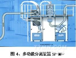 4、新式短流程開請棉機組中的第二個裝備是多功能分離裝置SP-MF,可將危險的異物從原料流中分離出去,包括金屬、重物、火源及帶火的物質等,另外還有清除灰塵、自動滅火、原料輸送及落棉從新喂入等功能。(見圖4)這個機器代替了金屬探測器、重物分離器、火警探測及滅火器等功能。多功能分離裝置 SP-MF,除了要完成上述任務外,還擔負著原棉的開松任務,開松的作用是柔和的,相對于整個開清棉流程又體現了開松的漸增性的原則,纖維損傷少,棉結產生少。