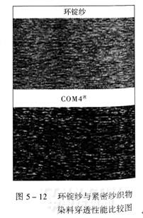 在進行免燙整理時,由于高溫高濕,普通環(huán)錠紗的織物強力下降 25%。緊密紗由于結(jié)構(gòu)緊密,強力高,可彌補免燙整理時織物的強力損失(圖5—13)。