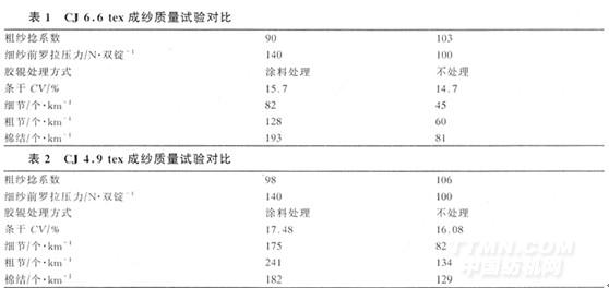 生產過程中,我們設計兩種工藝,分別在CJ6.6 tex和CJ4.9tex兩品種上試紡,試驗結果分別見表1、表2。