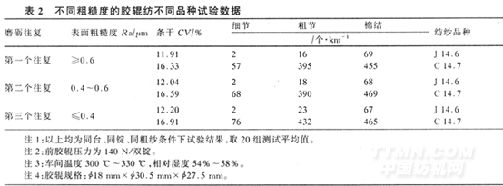 從以上數據可以看出,表面粗糙度值大,摩擦力大,有利于控制纖維,但絨輥花增多,斷頭機率上升;表面粗糙度值小,纖維在膠輥表面打滑,對纖維運動不能很好的控制,容易出硬頭,使成紗質量下降。我公司設計的產品經二個往復的磨礪,條干質量水平穩定在烏斯特2001公報25%的水平上。