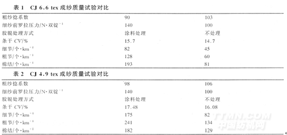 生產(chǎn)過程中,我們?cè)O(shè)計(jì)兩種工藝,分別在CJ6.6 tex和CJ4.9tex兩品種上試紡,試驗(yàn)結(jié)果分別見表1、表2。